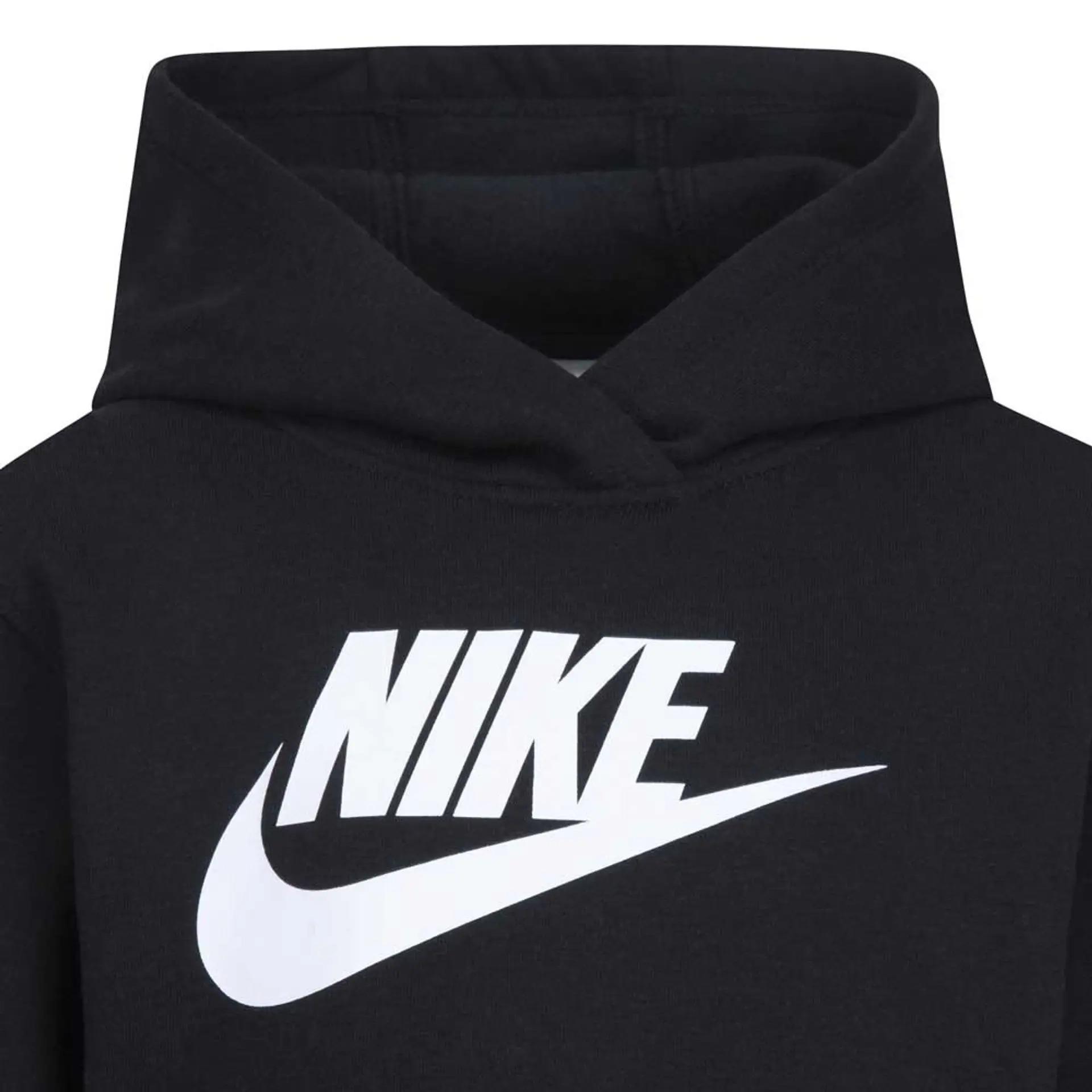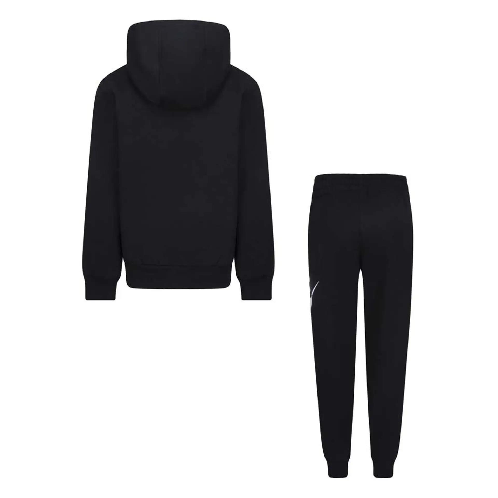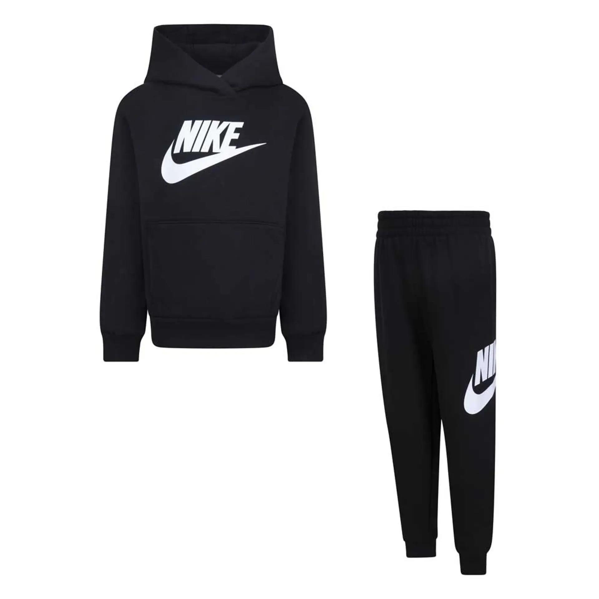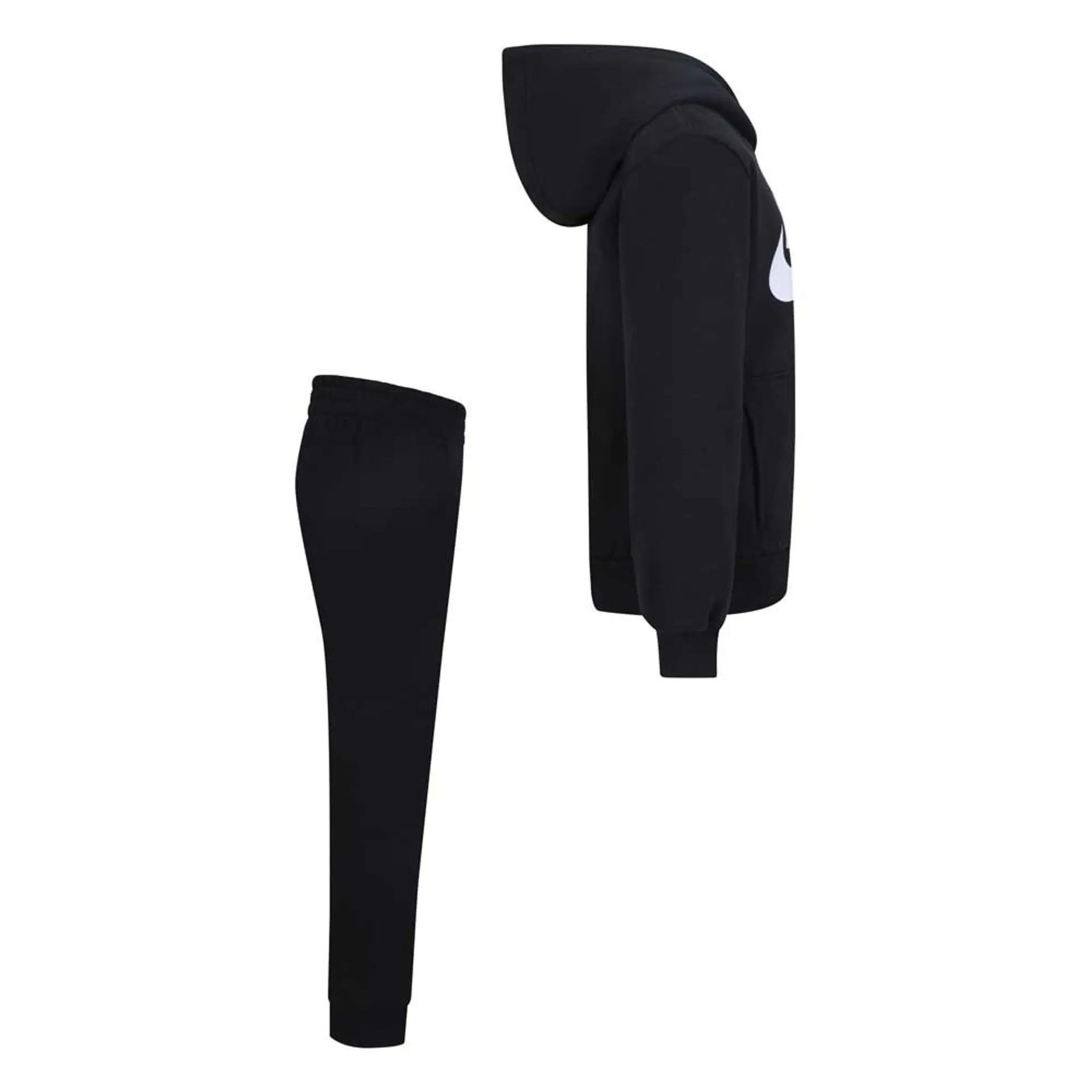 L'ensemble comprend un sweat à capuche et un pantalon de survêtement, tous deux fabriqués en polaire douce et confortable. Le sweat à capuche présente un grand logo Nike sur le devant, tandis que le pantalon de survêtement présente un logo plus petit sur la jambe. L'ensemble est parfait pour un usage quotidien, que votre enfant joue dehors ou se détende à la maison.