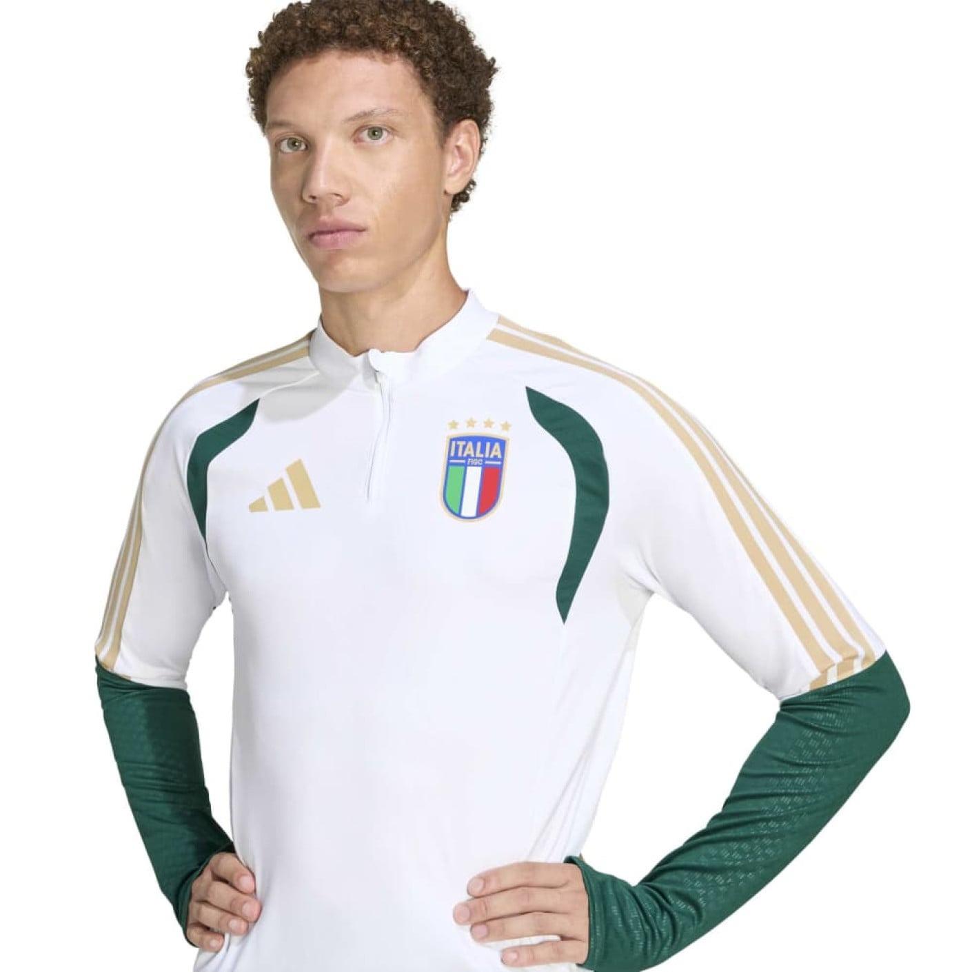 Voici le nouveau haut d'entraînement adidas Italie 1/4-Zip 2026-2028 Blanc Vert Doré. Les joueurs portent ce haut d'entraînement lors de leurs séances d'entraînement. Montrez que vous êtes fan des Azzurri en portant ce superbe haut d'entraînement Italie !