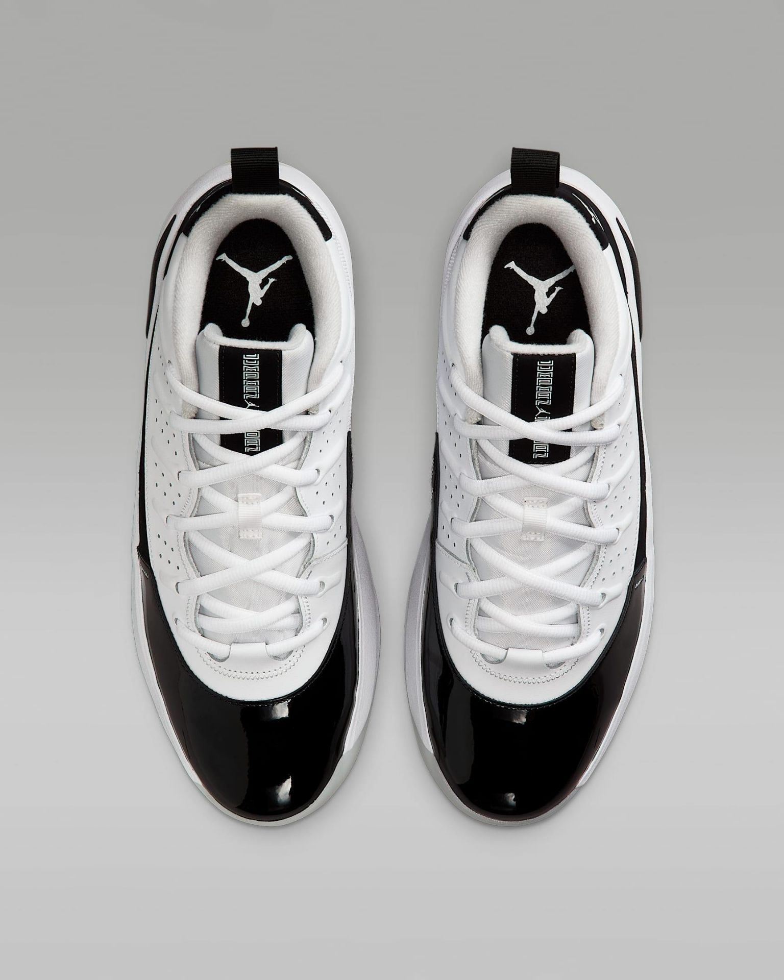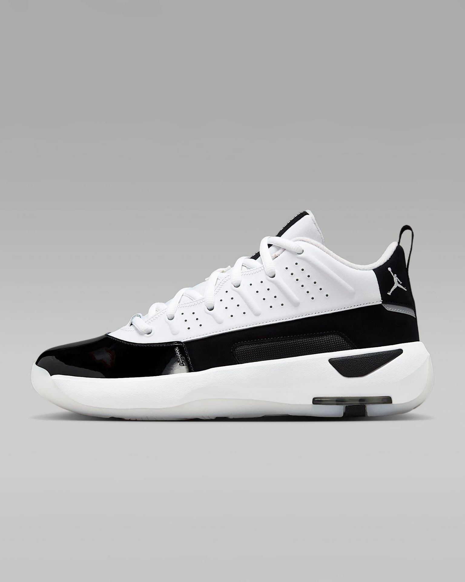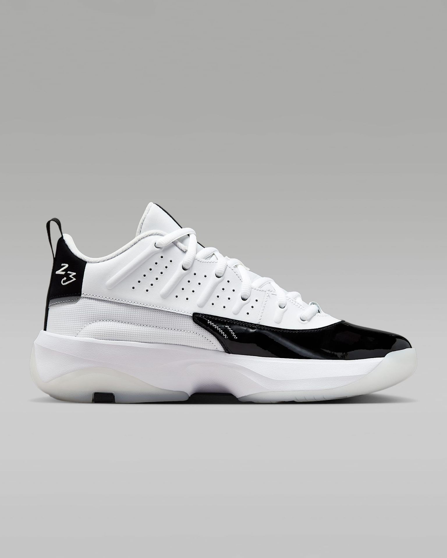 Les lignes ondulées près des lacets rappellent l'AJ10, tandis que les stries latérales et les touches de cuir verni brillant rendent hommage à l'AJ11. L'héritage Jordan réinventé.