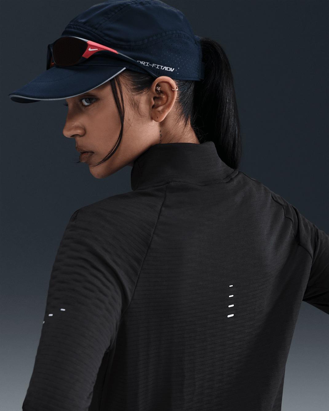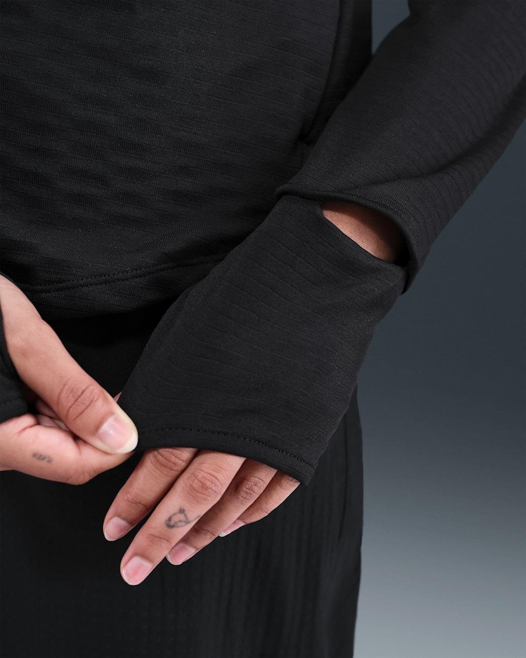 Sortez, même par temps froid. Notre pull à col roulé Swift est confectionné en tissu Therma-FIT doux qui régule la température corporelle. Les aérations aux poignets vous permettent de consulter votre montre sans quitter votre pull des yeux.